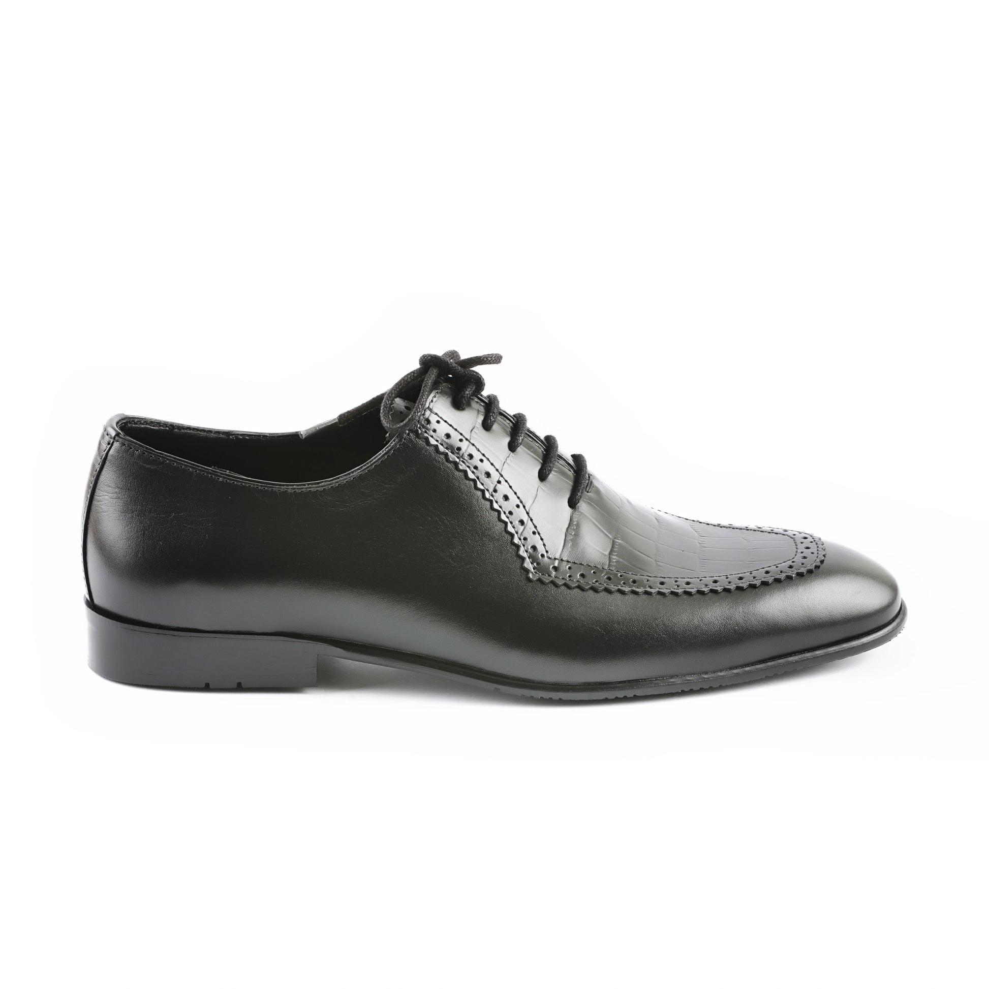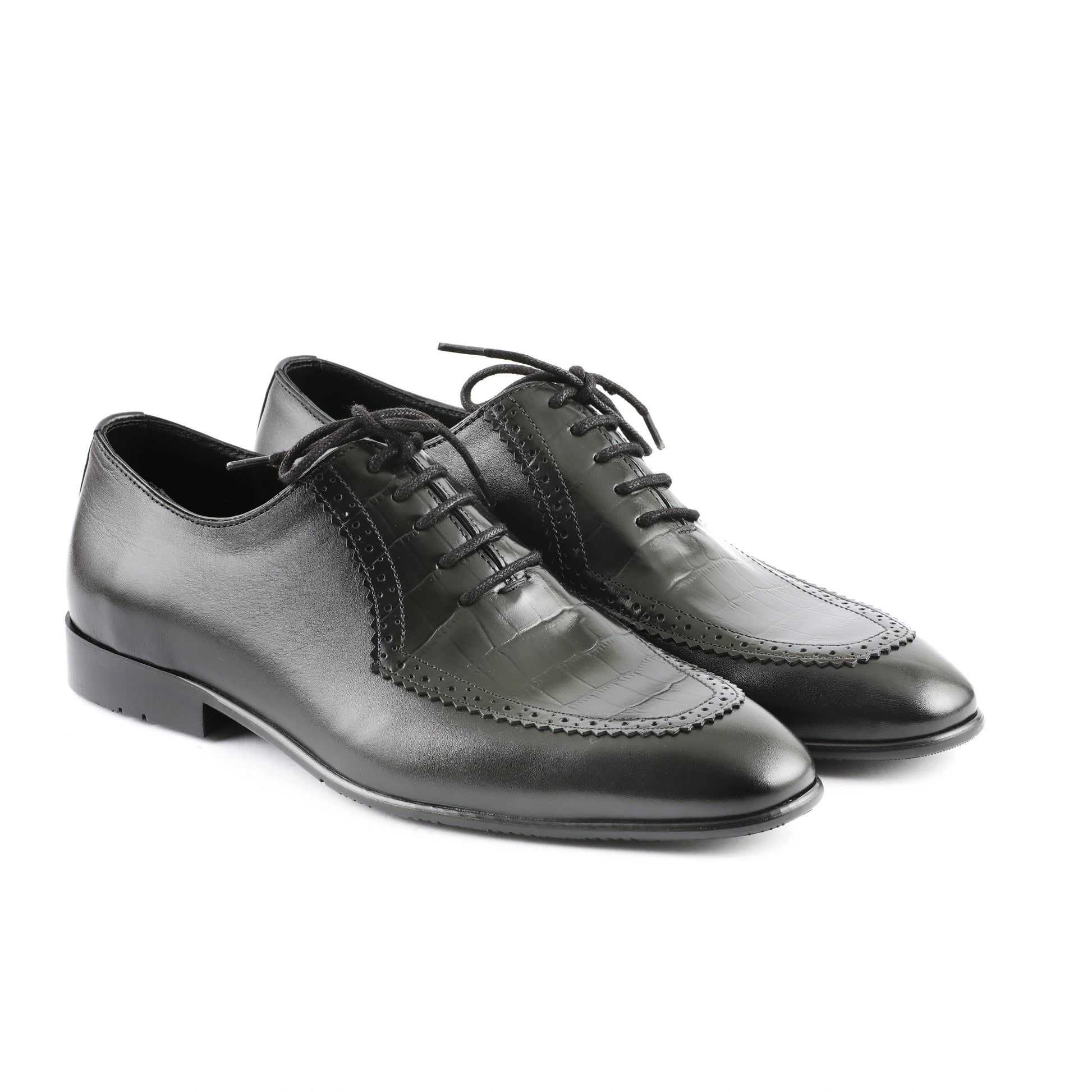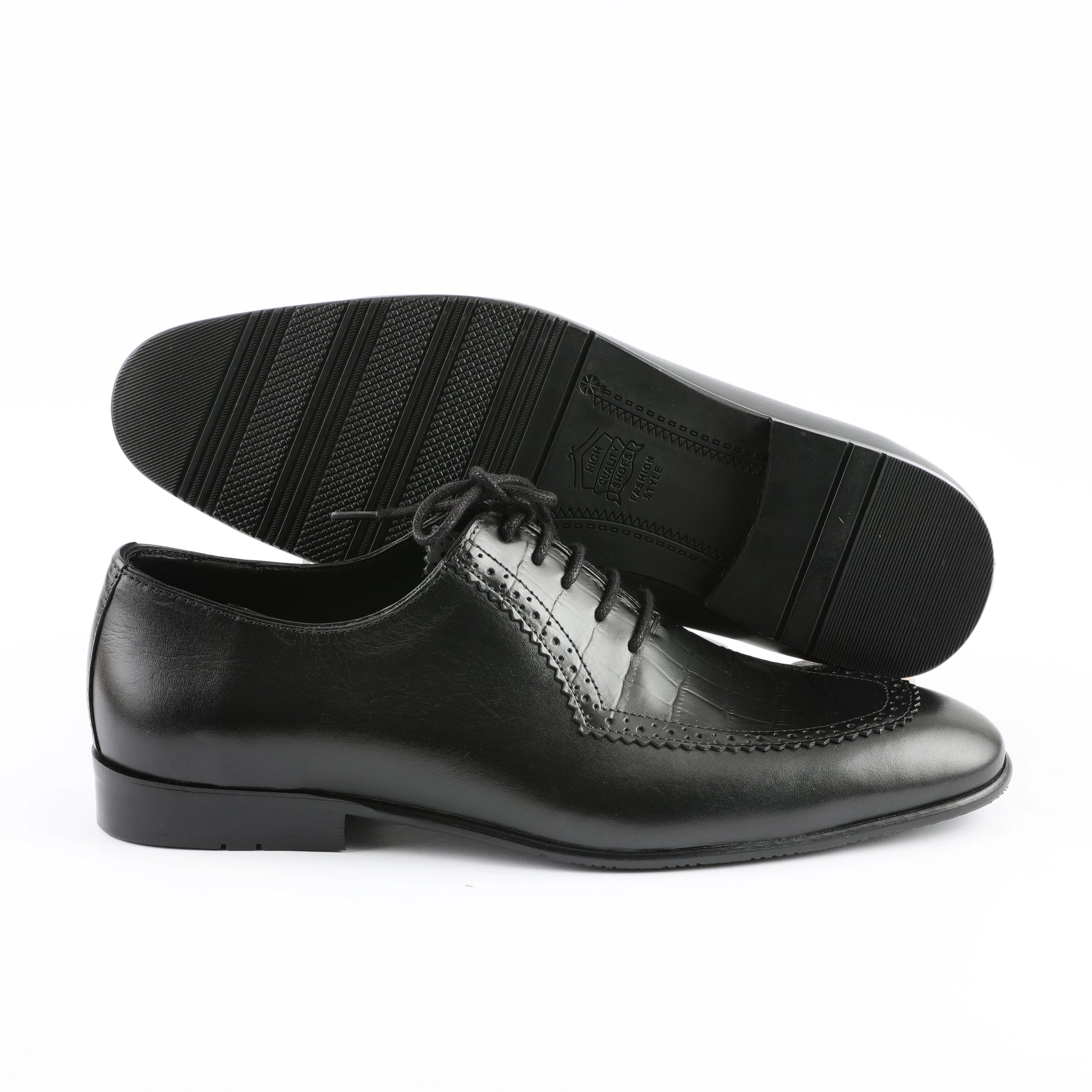 - The shoes are crafted from premium black leather. The leather quality is evident in its smooth texture and subtle sheen.