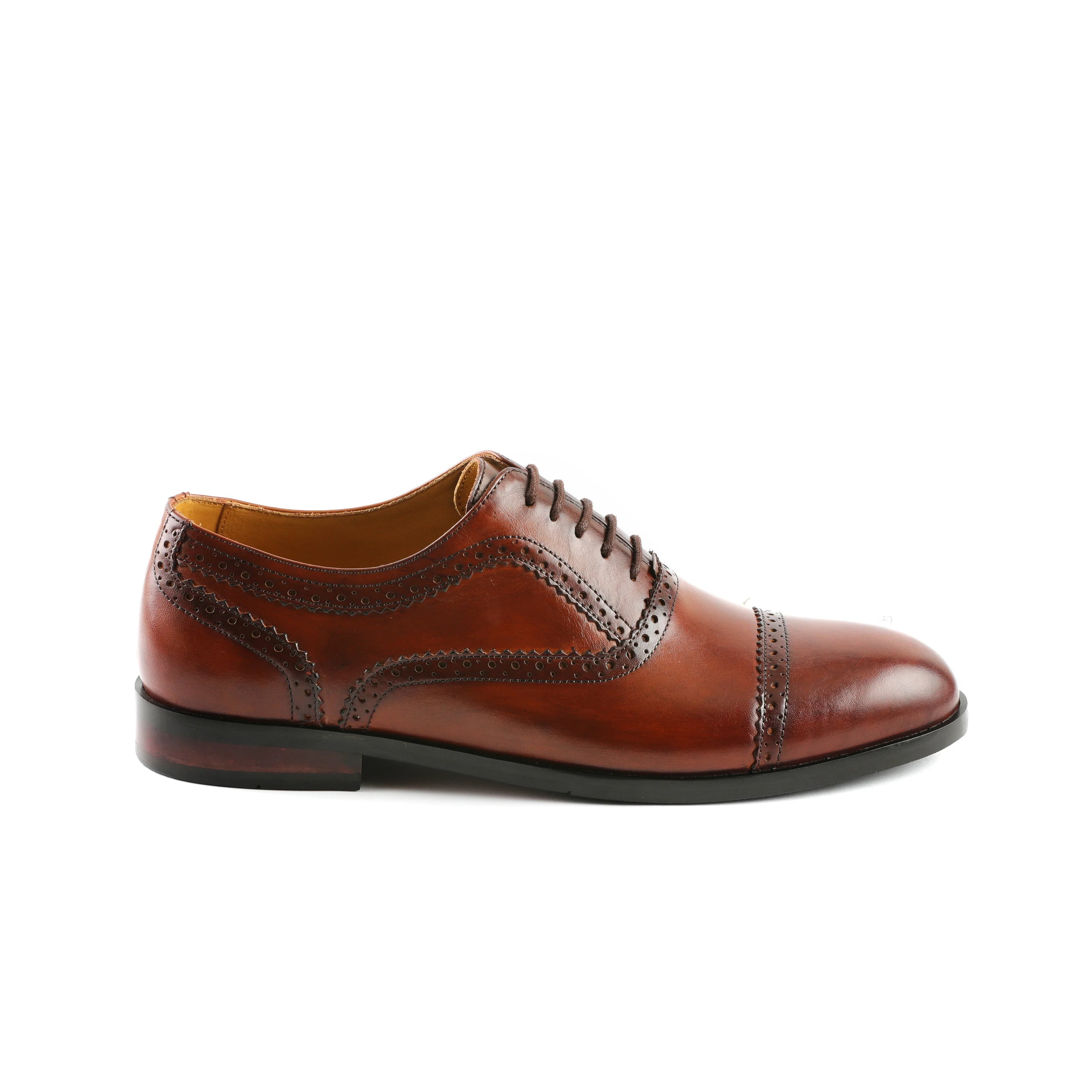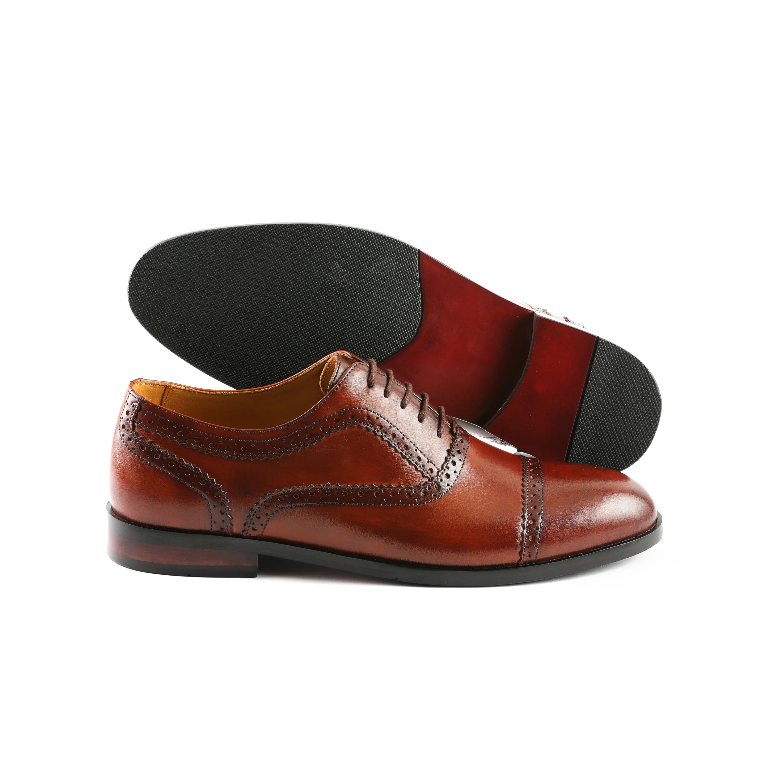 These stylish brown leather brogue Oxford shoes combine classic craftsmanship with a modern touch. Made from premium leather, they feature intricate brogue detailing along the seams and cap-toe, giving them a unique and sophisticated look. The closed lacing system offers a snug fit, while the cushioned inner lining provides lasting comfort. The sturdy, non-slip sole ensures durability and stability with every step. These versatile brogues are perfect for formal events, office wear, or elevating a smart-casual outfit, making them a must-have addition to any refined wardrobe.