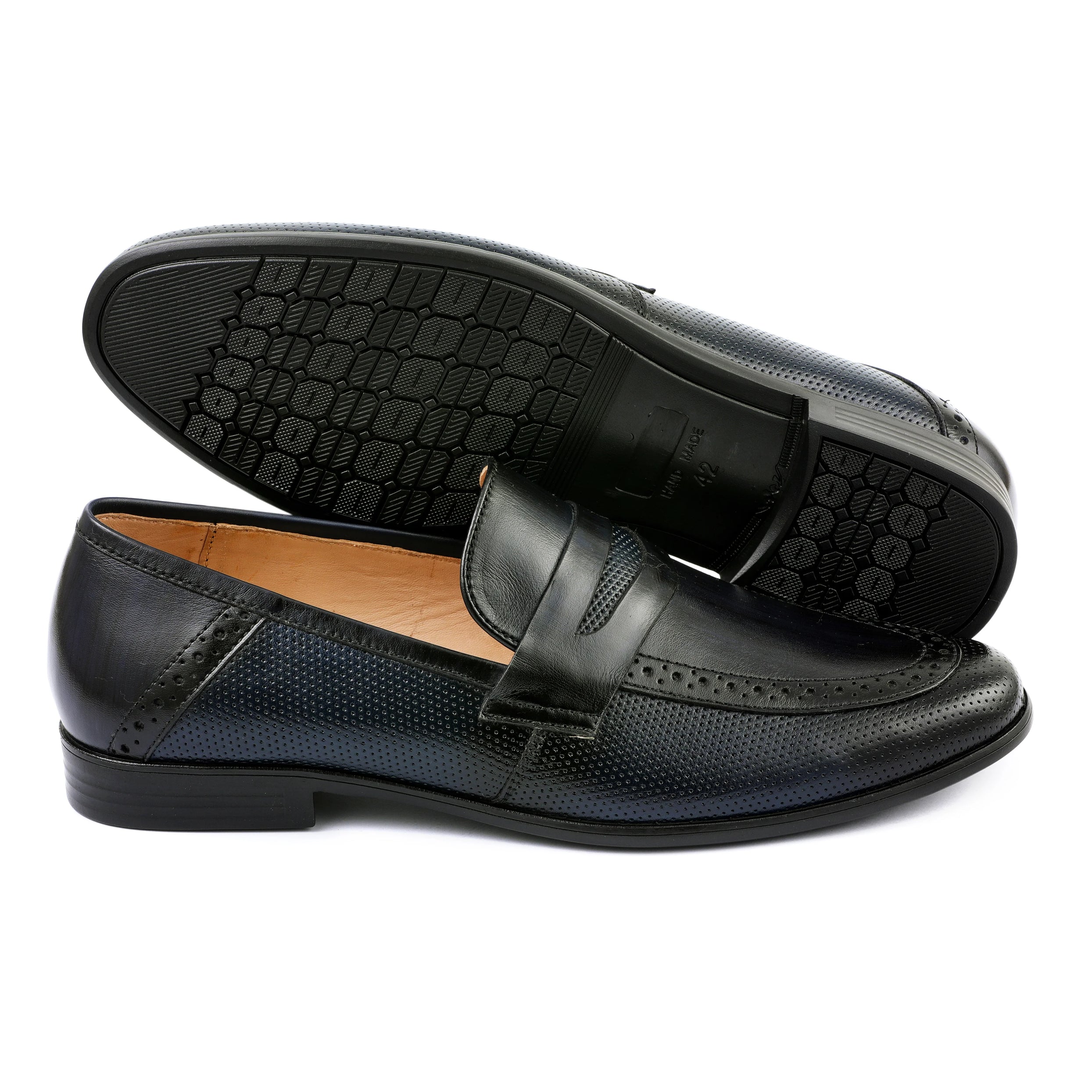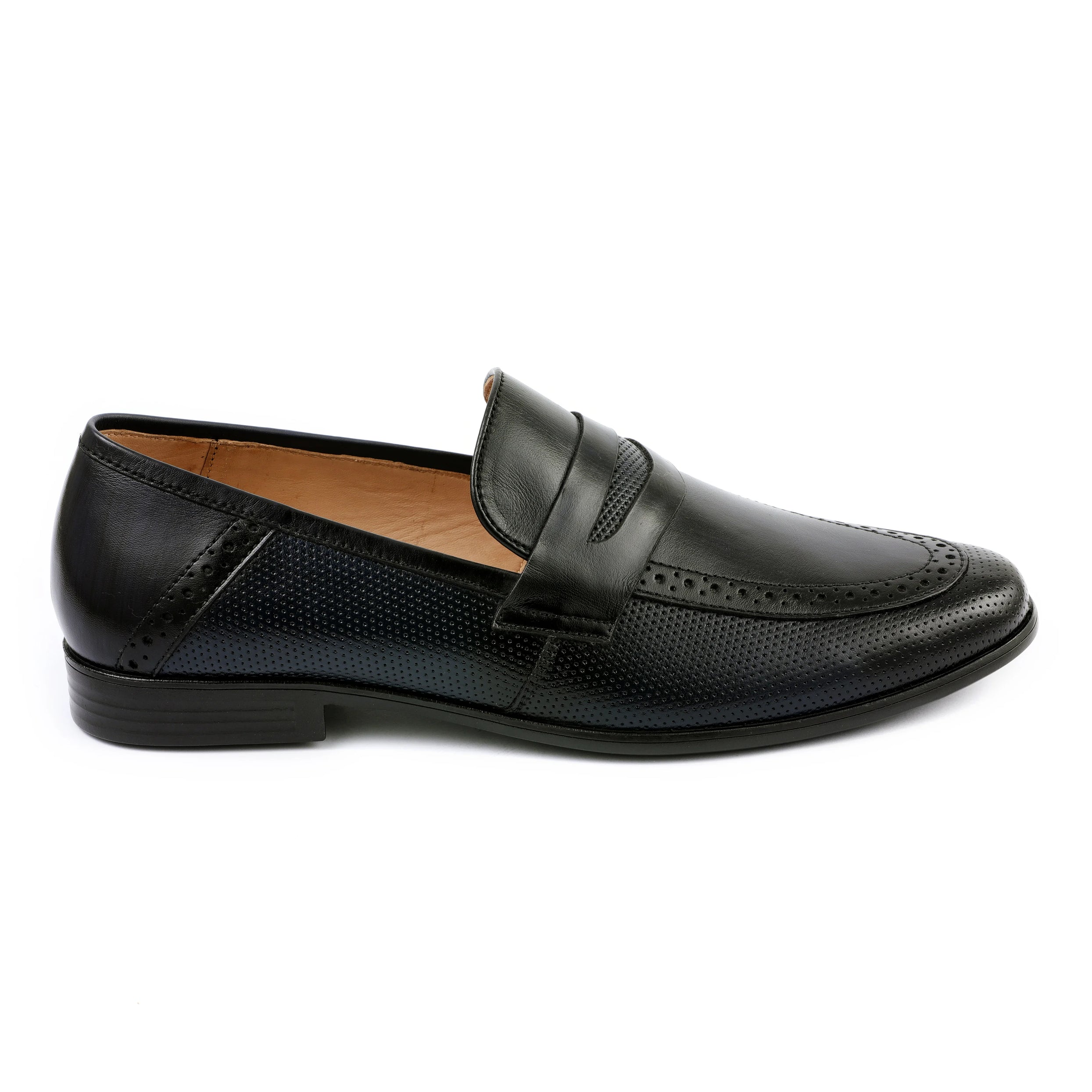 These Black Premium Leather Penny Loafers combine timeless elegance with contemporary craftsmanship. Featuring a smooth leather upper paired with finely perforated side detailing and subtle brogue-style accents, they offer a stylish yet versatile look suitable for any occasion. The soft inner lining ensures comfort, while the durable outsole provides long-lasting support for daily wear.