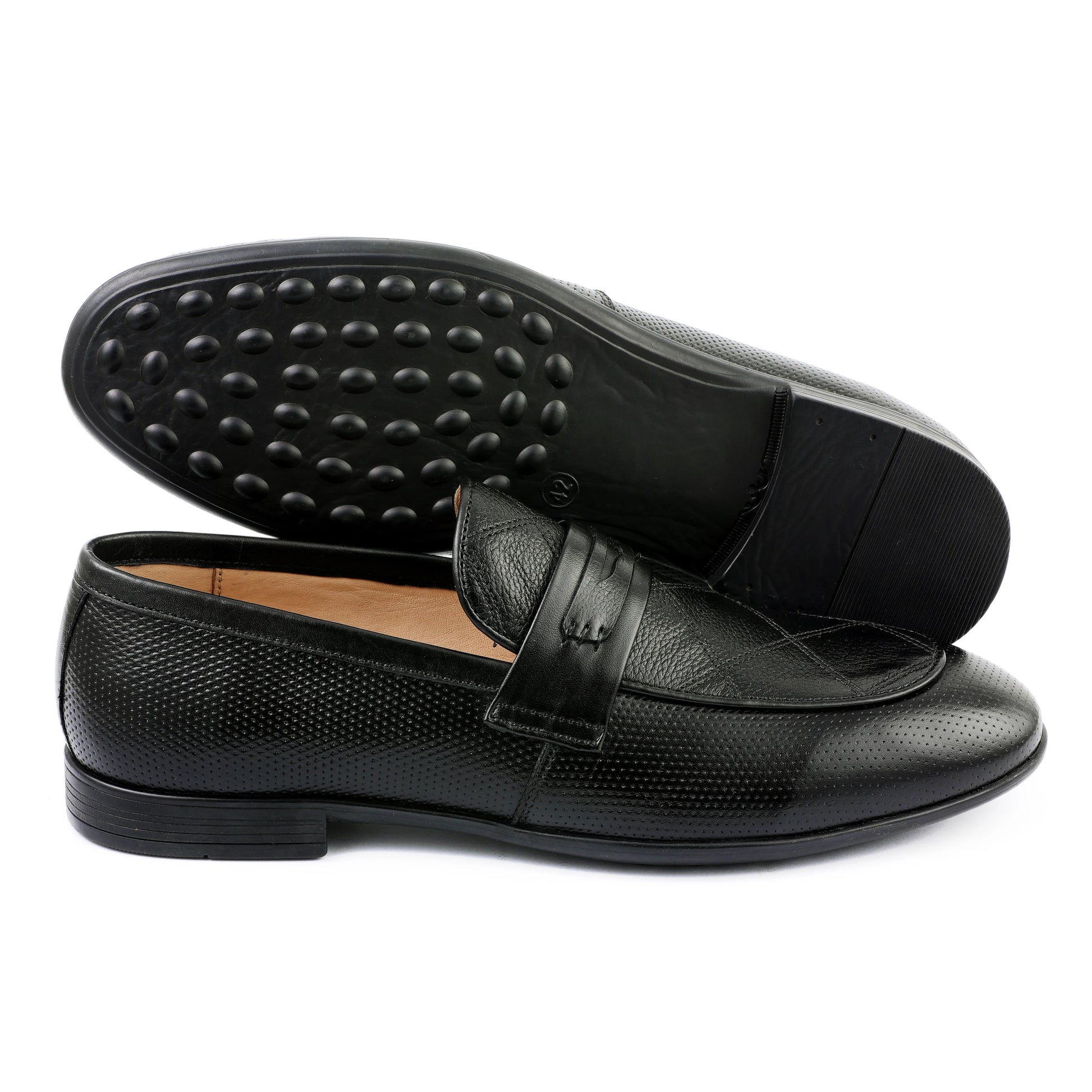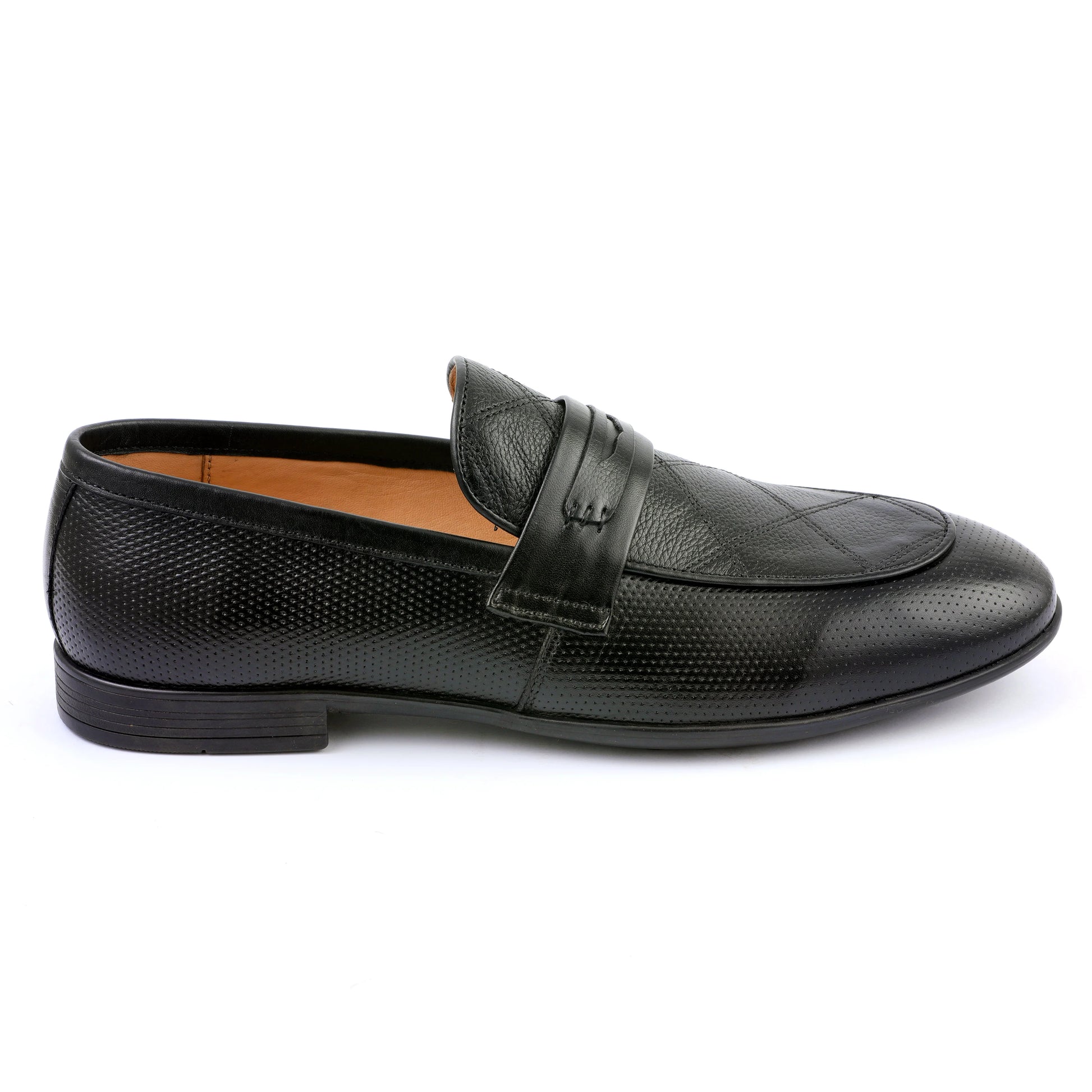 These Black Textured Leather Penny Loafers blend classic sophistication with modern craftsmanship. The design features smooth leather on the upper with subtle stitched detailing, paired with a fine micro-textured finish on the sides for a refined and contemporary look. Soft inner padding ensures comfort, making them perfect for daily wear or formal occasions.