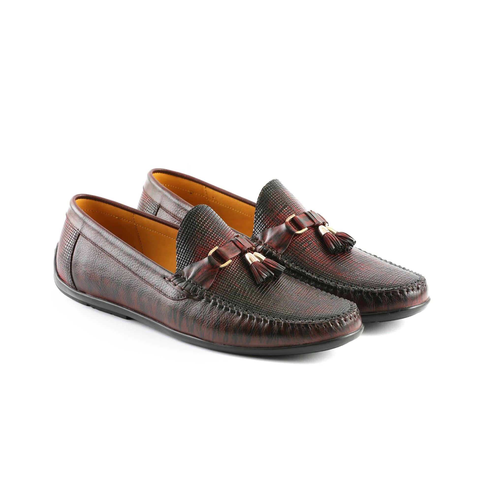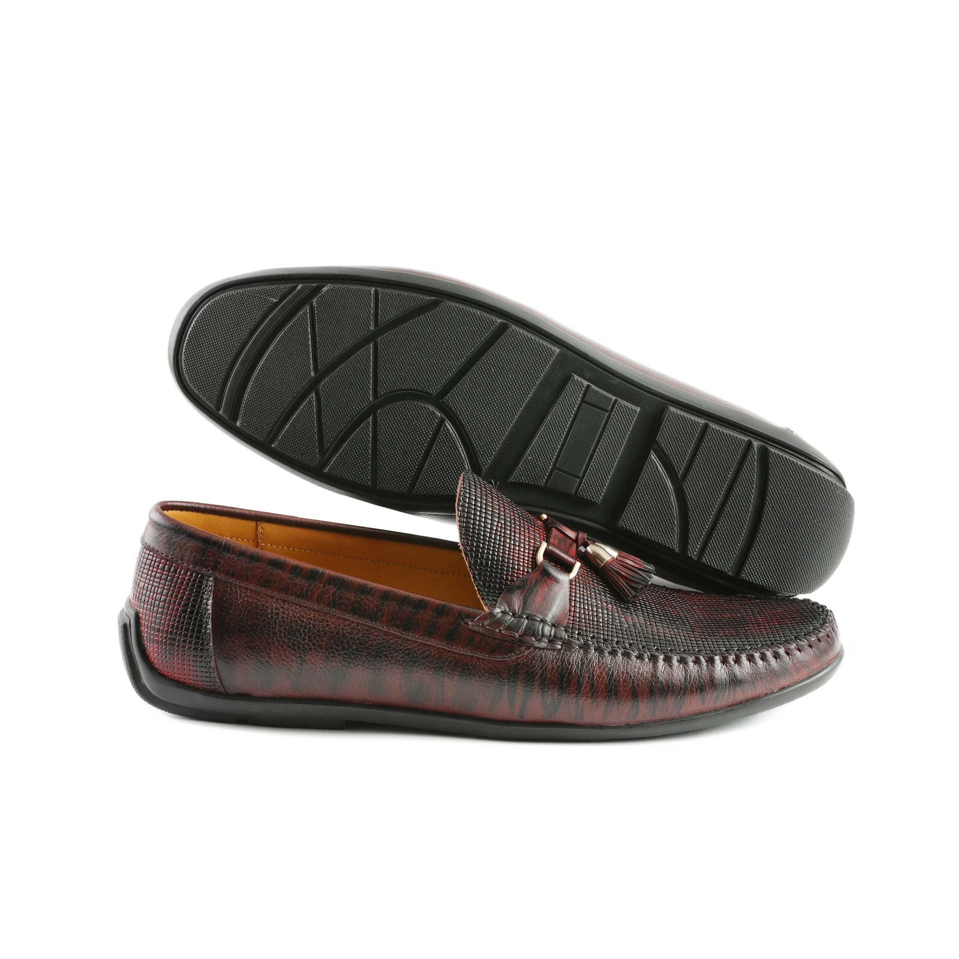 Upgrade your wardrobe with these sophisticated men’s leather loafers, perfect for formal settings. These loafers feature a rich brown leather finish with subtle red undertones and a woven texture, offering a contemporary yet classic design. The standout tassel detail on the front, combined with the elegant gold buckle accents, adds a refined touch to this timeless pair.