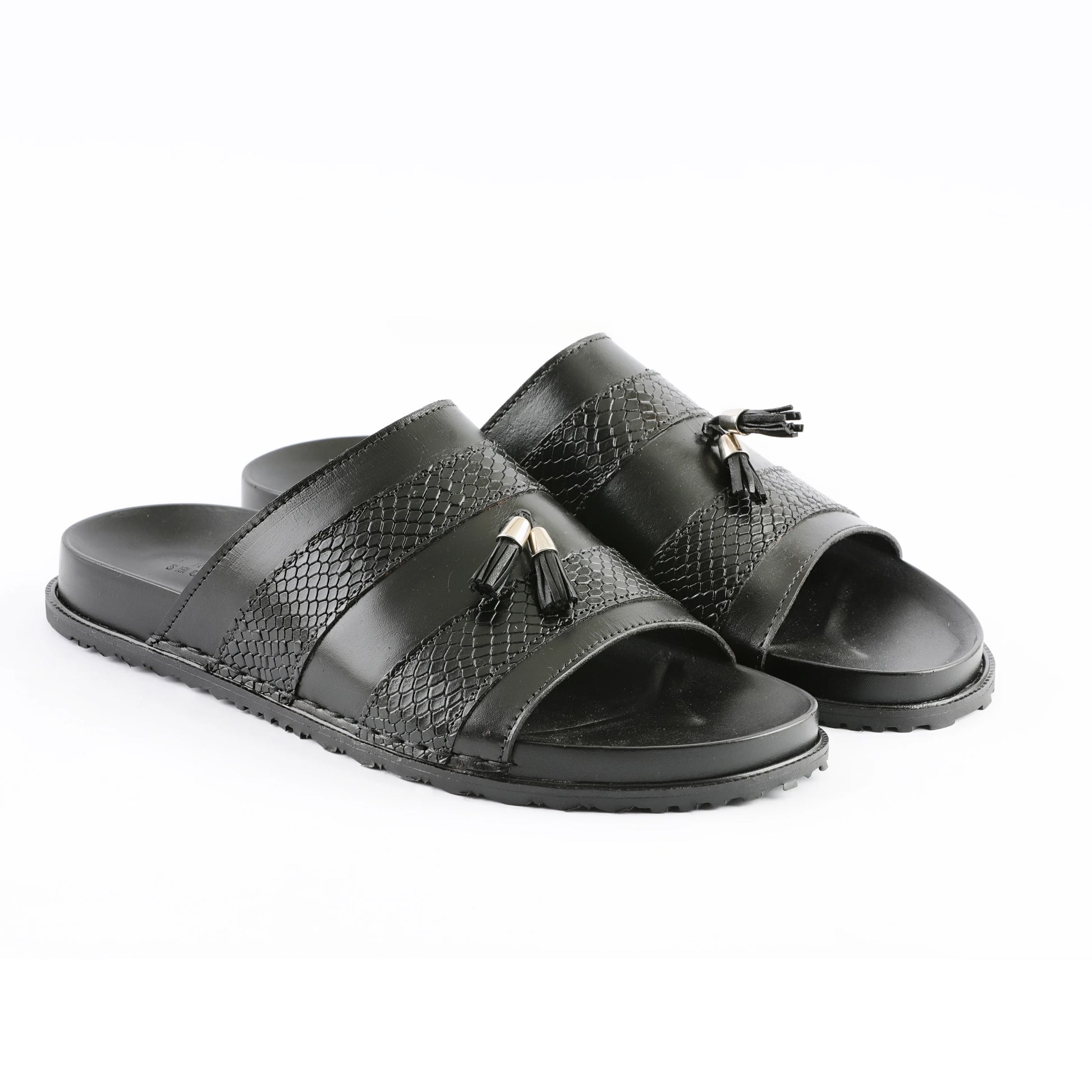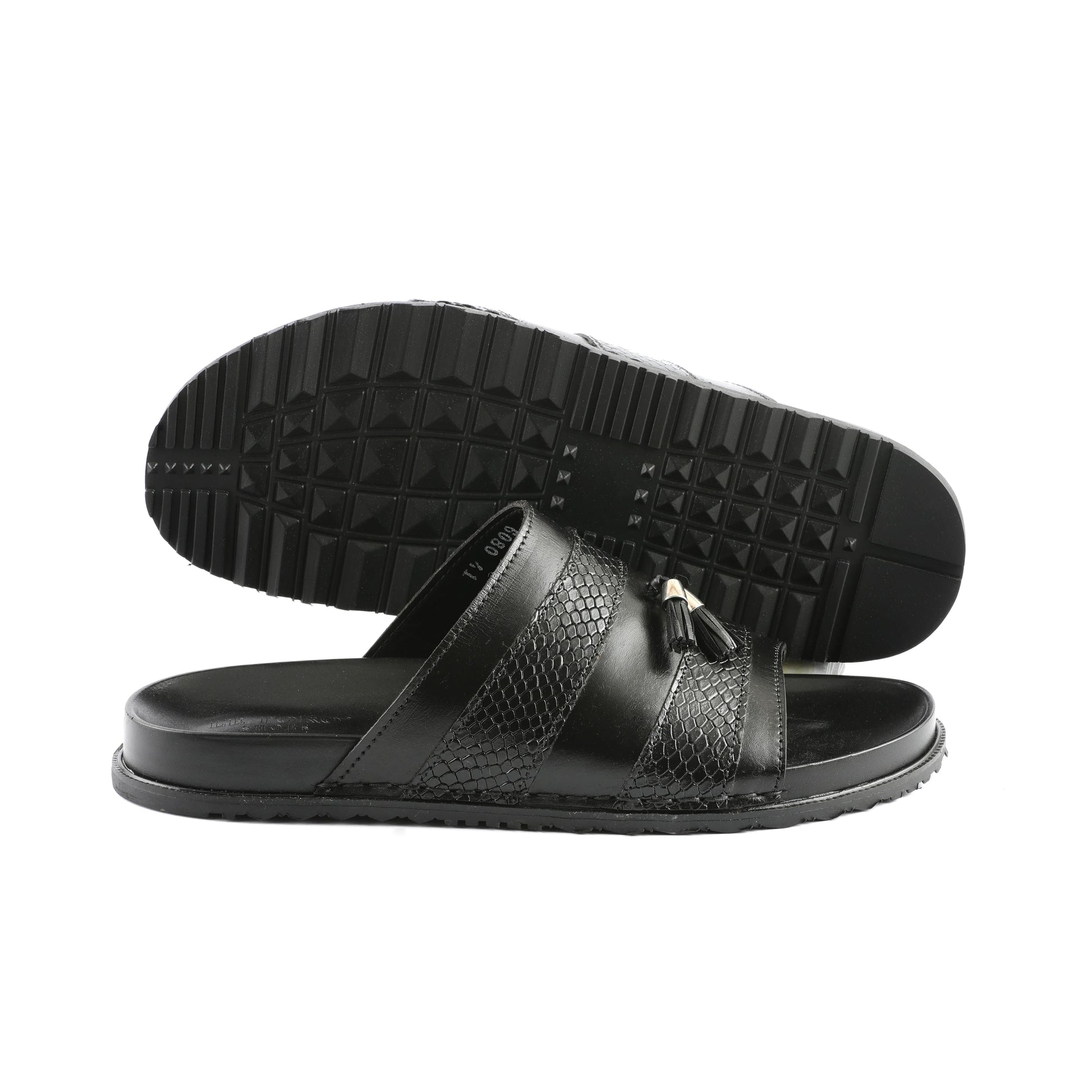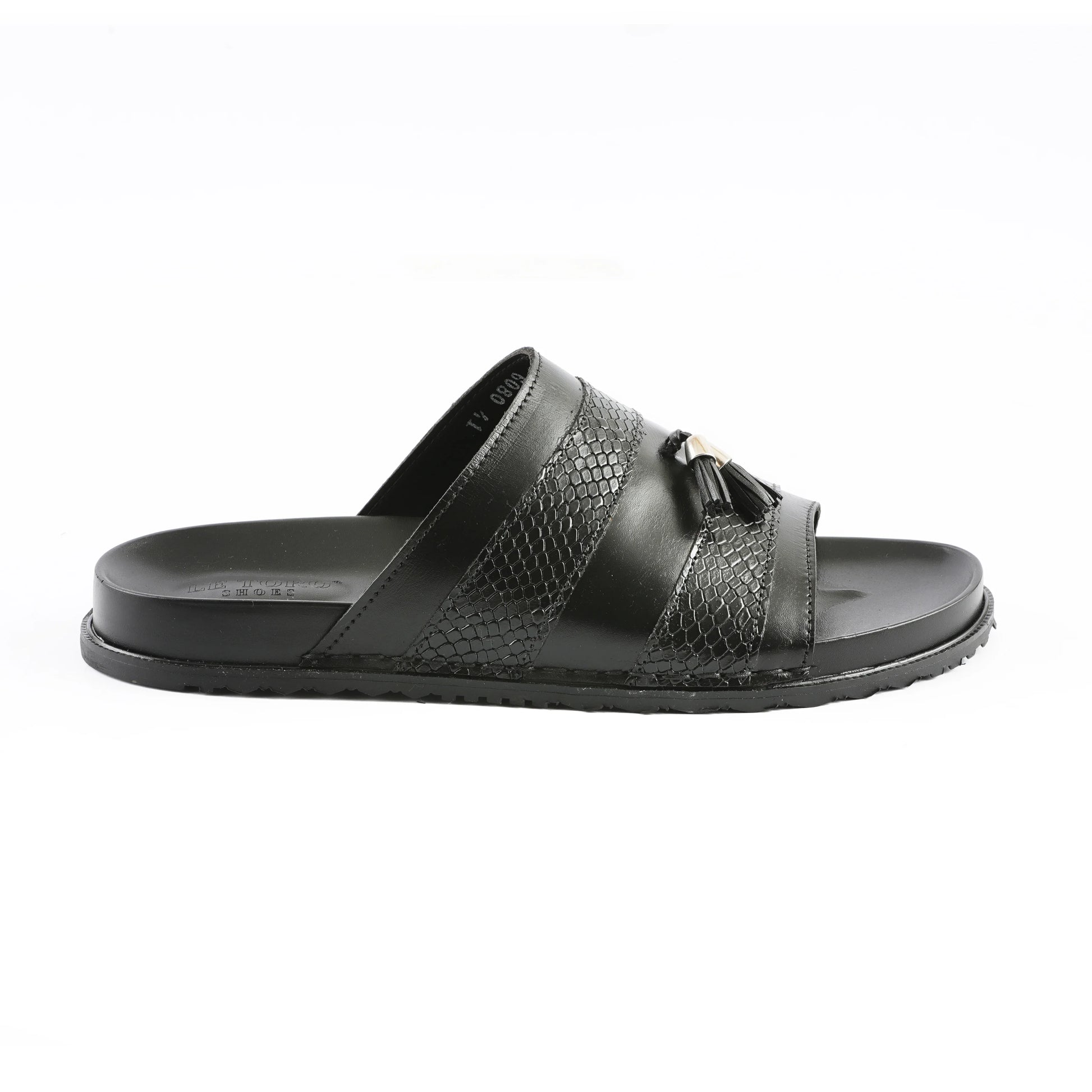 - Crafted from high-quality black leather, these slippers showcase a luxurious and elegant aesthetic.